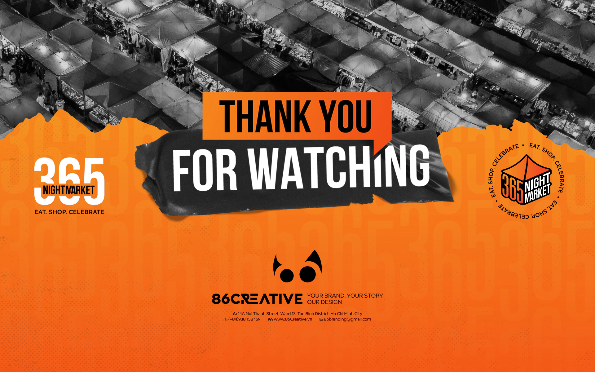 Logo của 365 Night Market lấy cảm hứng từ văn hóa chợ đêm châu Á, nơi những gian hàng rực rỡ ánh đèn không chỉ bày bán ẩm thực đặc sắc mà còn là điểm giao thoa của văn hóa cộng đồng. Hình tượng lều chợ cách điệu gợi lên không khí nhộn nhịp, sôi động của những khu chợ đêm, nơi con người gặp gỡ, hương vị hòa quyện và bản sắc được tôn vinh.
